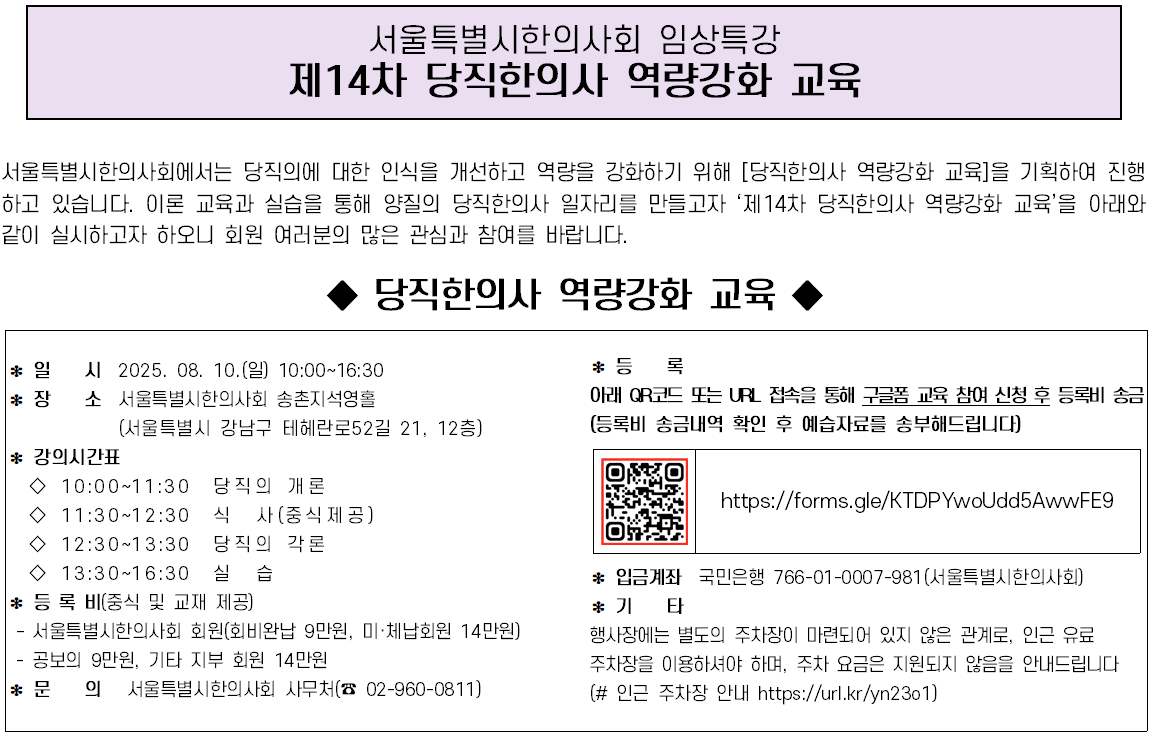 오는 2025년 08월 10일(일), 서울특별시한의사회 '송촌지석영홀'에서 제14차 교육이 진행될 예정이오니, 회원분들의 많은 관심과 참여를 부탁드립니다.